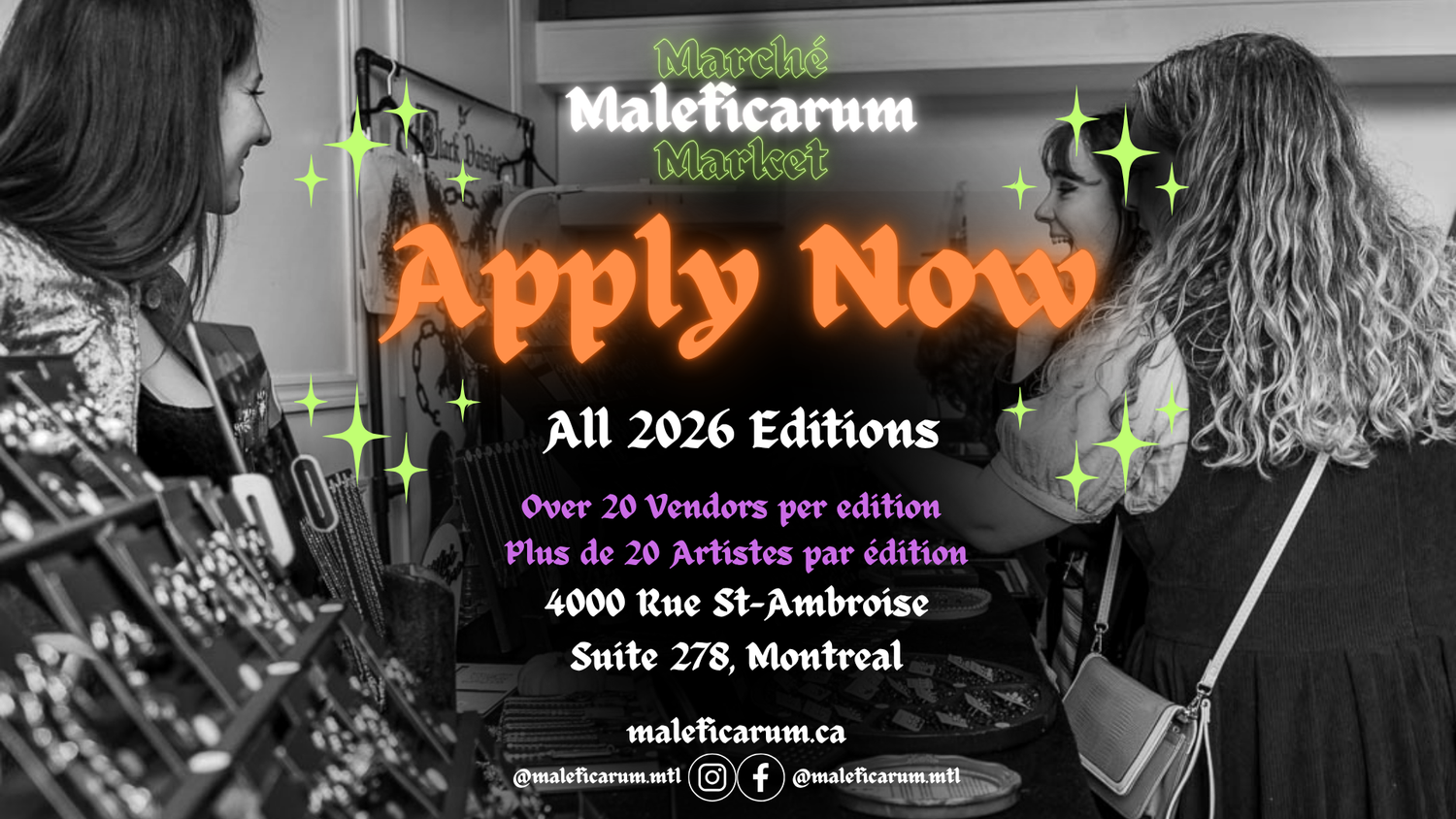 Maleficarum Market is an alternative, witchy, gothic & queer artisan market. We showcase over 20 artist per edition. We host 5 Editions a year with different themes to highlight all facets of our underground culture! Join us at the Inchoo Bijoux Boutique, near Atwater Market, in Montreal. Each edition has special "activities" such as Tarot readings, Palm Readings, Flash Tattoos, Henna tattoos and more! Come see what the hype is all about!