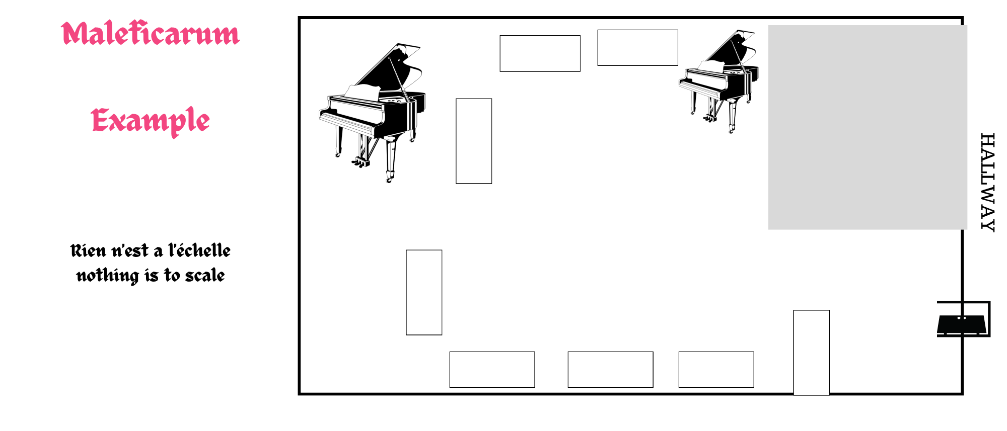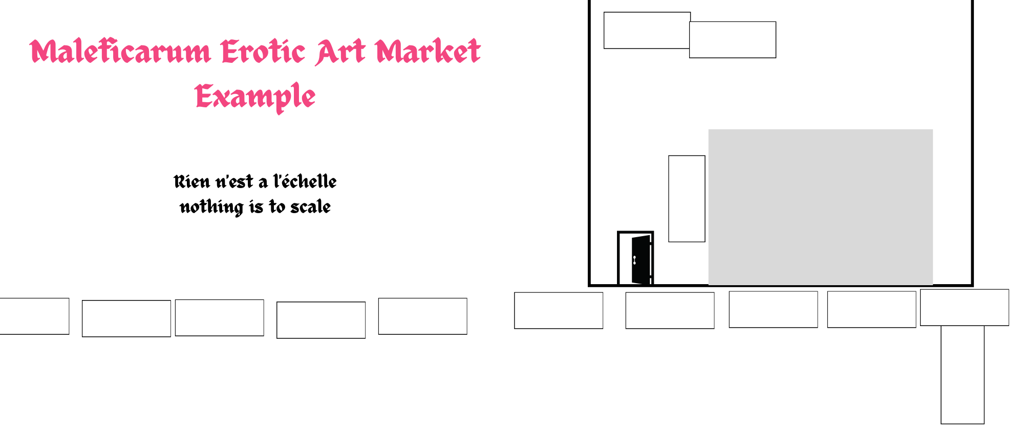 The images aren't up to scale. If you have special requirements for your booth, please let us know as soon as possible. We try to accommodate as many requests as possible. Please keep in mind that we are a very small team and do our best to keep everyone happy.